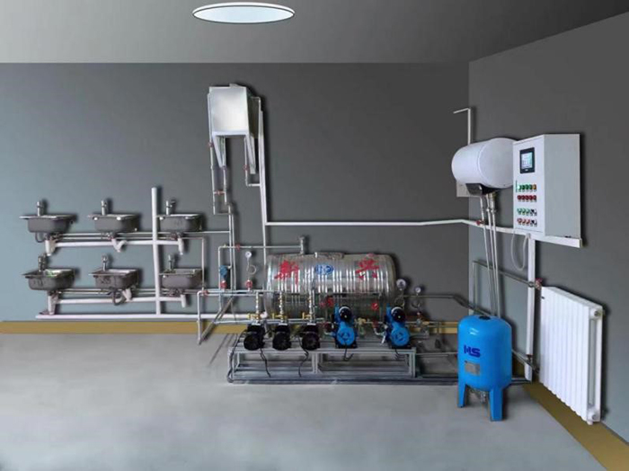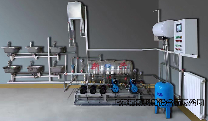 1、生活給水系統(tǒng):主要有給水箱、給水泵、給水管道、壓力變送器、脈沖水表、水龍頭和淋浴頭等組成。管路采用不銹鋼管進(jìn)行設(shè)計,可進(jìn)行不銹鋼管的切割、安裝和通水試驗操作,通過控制系統(tǒng)可實現(xiàn)生活給水系統(tǒng)的變頻恒壓供水功能,實現(xiàn)單泵變頻控制或雙泵切換控制等功能;通過脈沖式水表可以完成用水量的計量。
