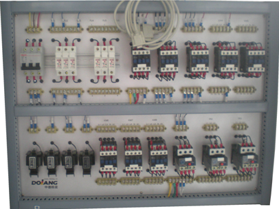 裝置實(shí)驗(yàn)柜正面為車床和銑床的機(jī)床電氣線路元器件布線區(qū)面板。背面是鉆床和磨床的機(jī)床電氣線路元器件布線區(qū)面板。面板上裝有低壓斷路器、直插式保險(xiǎn)絲、交流接觸器、熱繼電器、控制變壓器等元器件,這些元器件直接安裝在面板表面,可以很直觀的看它們的動(dòng)作情況,且都有相應(yīng)的測試點(diǎn),方便接線及故障考核檢測線路操作。