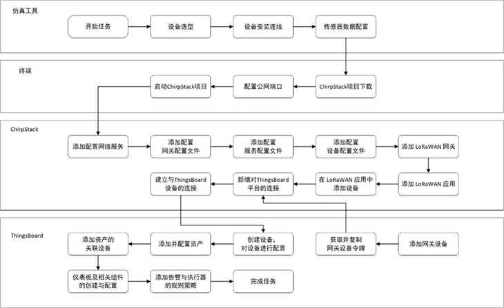 模擬智慧牧場(chǎng)系統(tǒng)還引入使用開(kāi)源軟件平臺(tái)ChirpStack與ThingsBoard,結(jié)合LPWAN技術(shù),實(shí)現(xiàn)遠(yuǎn)程低功耗數(shù)據(jù)采集、上報(bào)和展示。在ChirpStack平臺(tái)上,用戶可對(duì)網(wǎng)關(guān)、GPS、溫濕度傳感器等設(shè)備進(jìn)行配置,以上送仿真實(shí)驗(yàn)中的虛擬數(shù)據(jù)。在ThingsBoard平臺(tái)上,設(shè)置牧場(chǎng)地圖、告警信息、溫濕度等各儀表盤組件;獲取仿真設(shè)備上送的數(shù)據(jù),并將數(shù)據(jù)以圖表形式作可視化呈現(xiàn);以及基于流式編程添加相應(yīng)的規(guī)則策略,最終完成模擬智慧牧場(chǎng)實(shí)訓(xùn)場(chǎng)景的部署搭建。