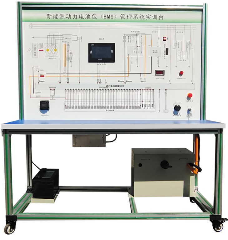 磷酸鐵鋰動力電池包與鐵制電池箱(單體電池3.2V 20AH,24串)、BMS鋰電管理一體機(jī)、動力電池包觸摸顯示屏、車載充電機(jī)、國標(biāo)充電插口、國標(biāo)充電槍、緊急斷電開關(guān)、霍爾電流傳感器、直流接觸器(包含充電繼電器、總正繼電器、總負(fù)繼電器、預(yù)充繼電器)、DC-DC轉(zhuǎn)換器(72V-12V30A)、輔助蓄電池(12V45AH)、放電控制繼電器與放電負(fù)載電阻、預(yù)充電阻器、可移動實(shí)訓(xùn)臺(1500×700×1700mm 帶自鎖腳輪裝置,帶安裝檢測端子的原理面板,面板1448×940mm)、故障模擬與排除裝置、設(shè)備操作說明書。